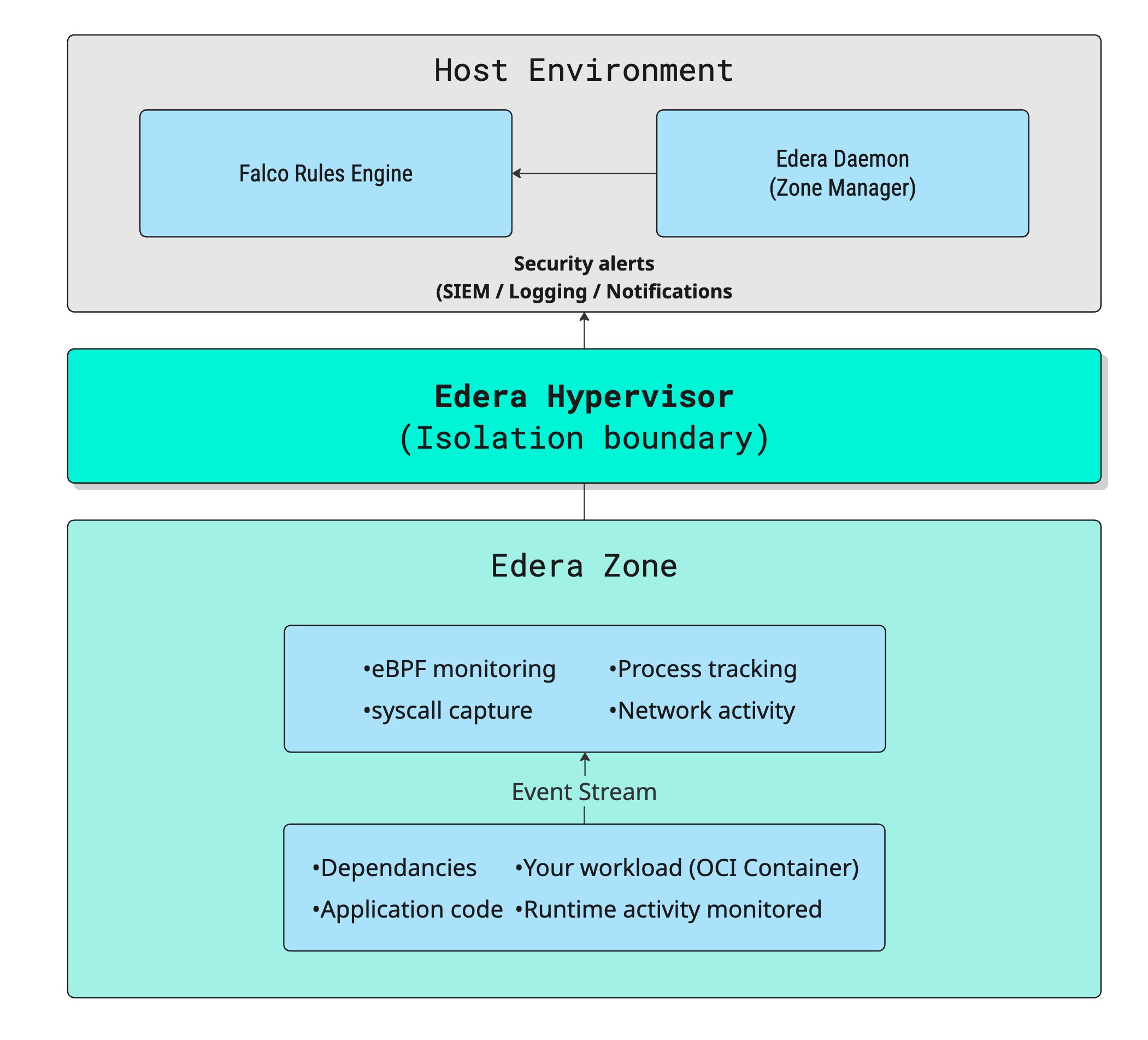 We've built a native Falco plugin that seamlessly exchanges syscall events from Edera zones (our microVMs) to your existing Falco deployment. The integration leverages Falco's stable plugin API and wraps Falco's libscap library to ensure complete syscall coverage. This means: