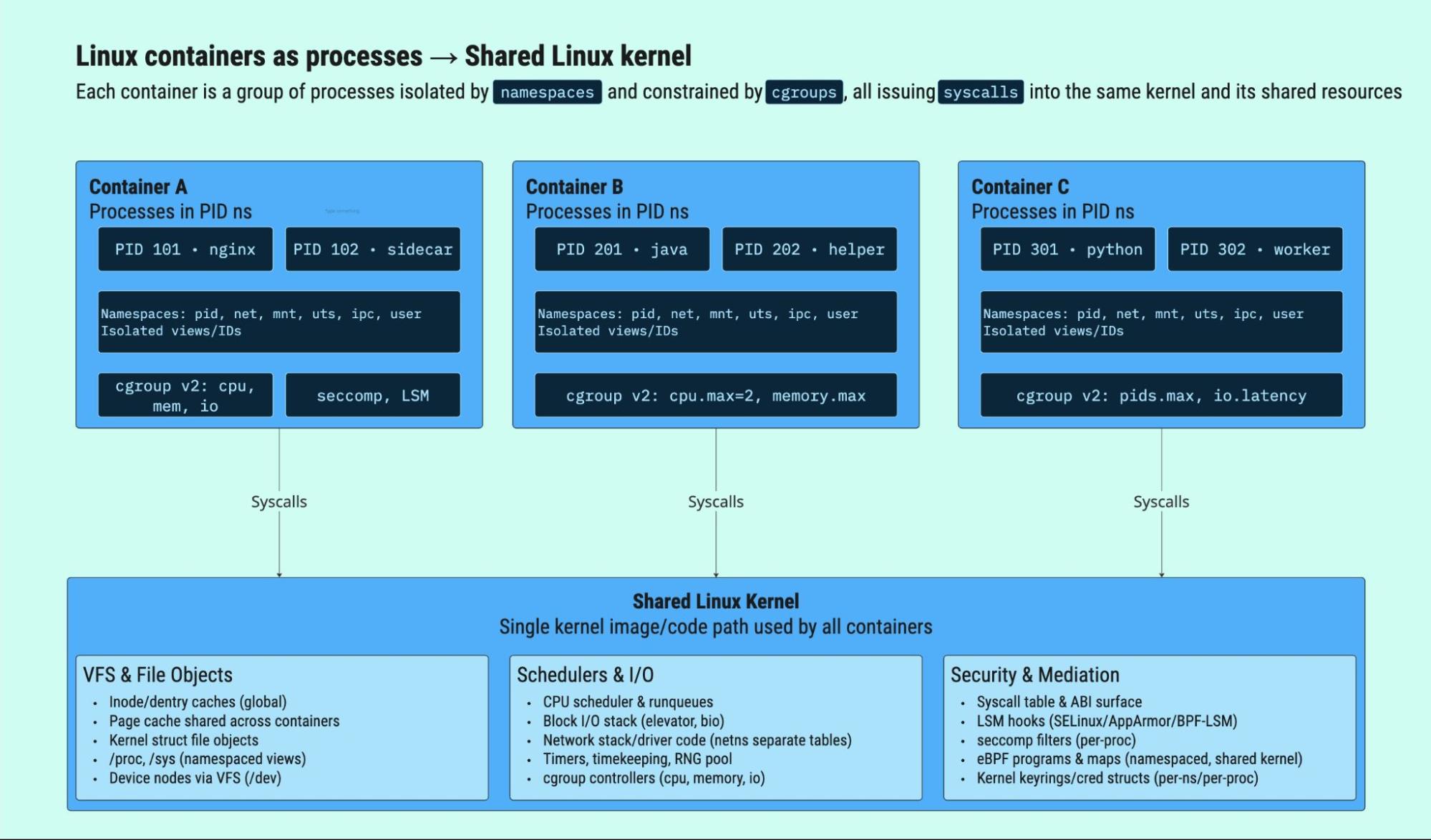 Linux uses namespaces, cgroups, and capabilities to segment resources, but all containers still share the same kernel.