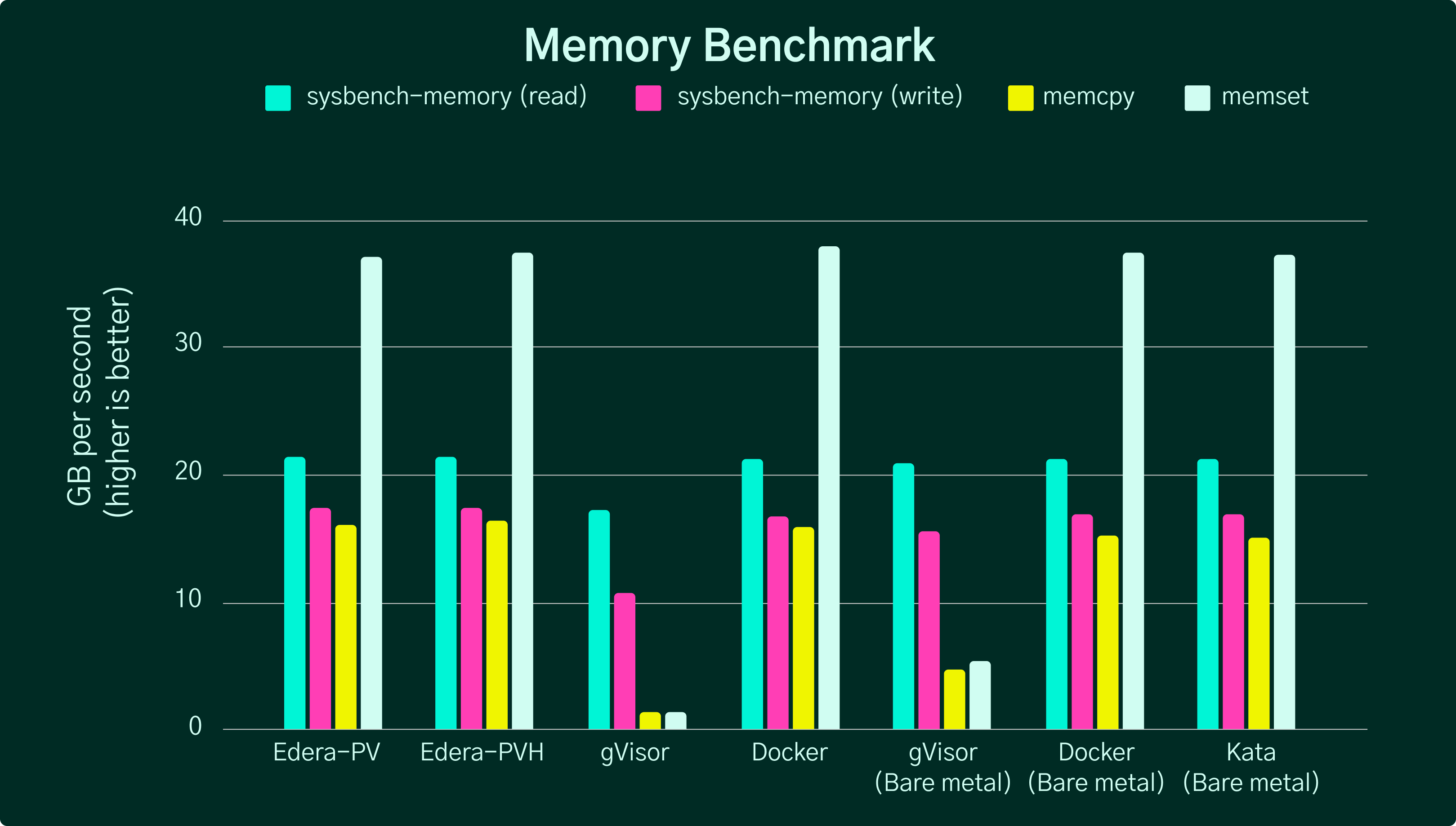 These results demonstrate that Edera's virtualization approach maintains near-native memory performance while adding strong isolation. gVisor shows the poorest memory performance across all tests, reflecting the overhead of its userspace kernel approach.